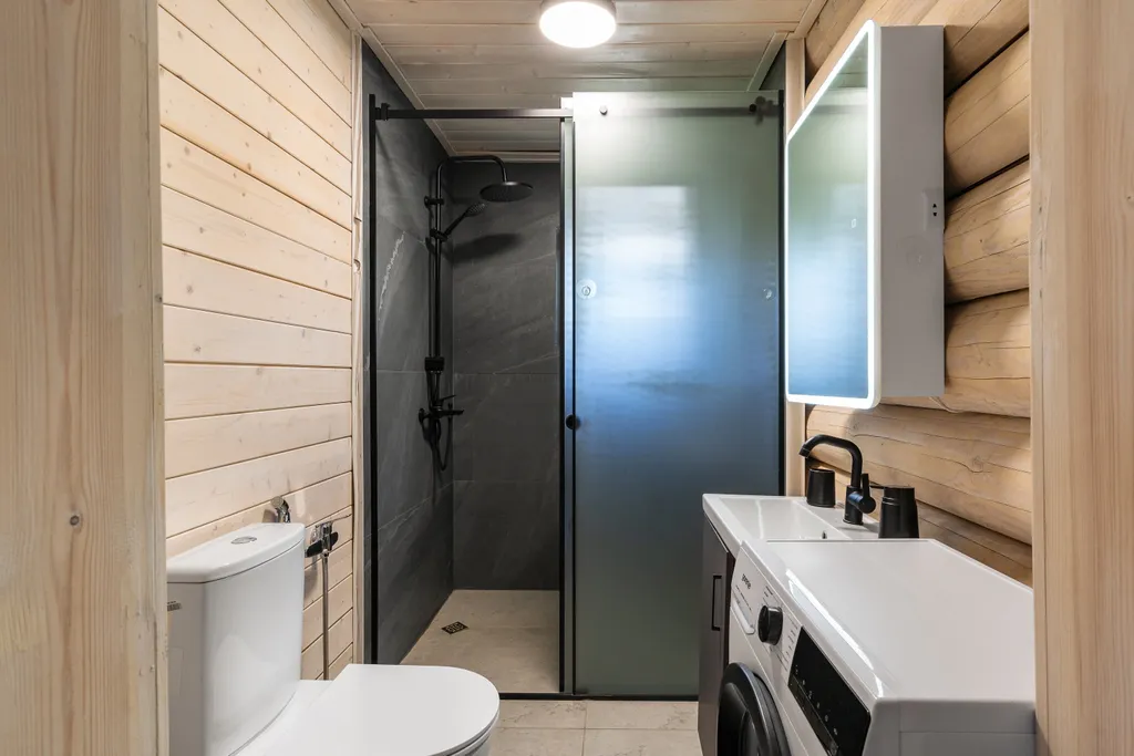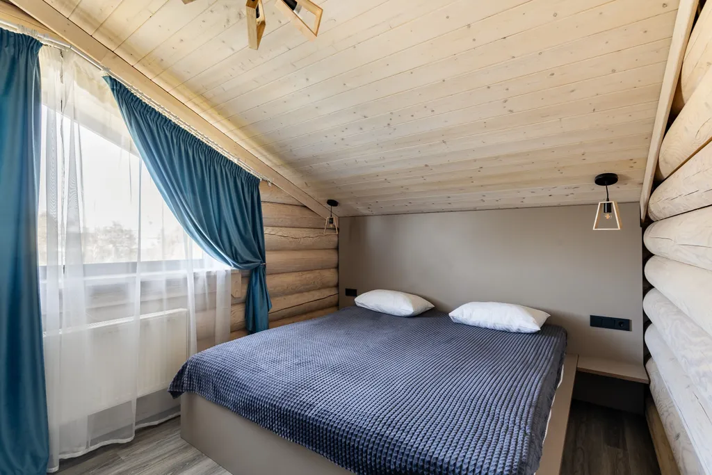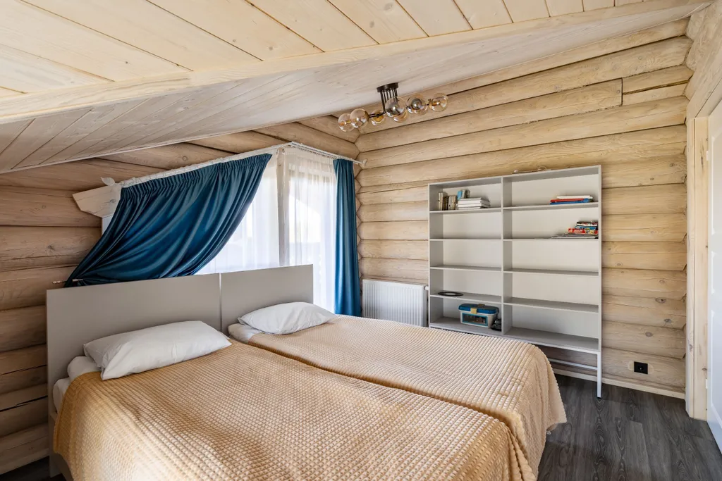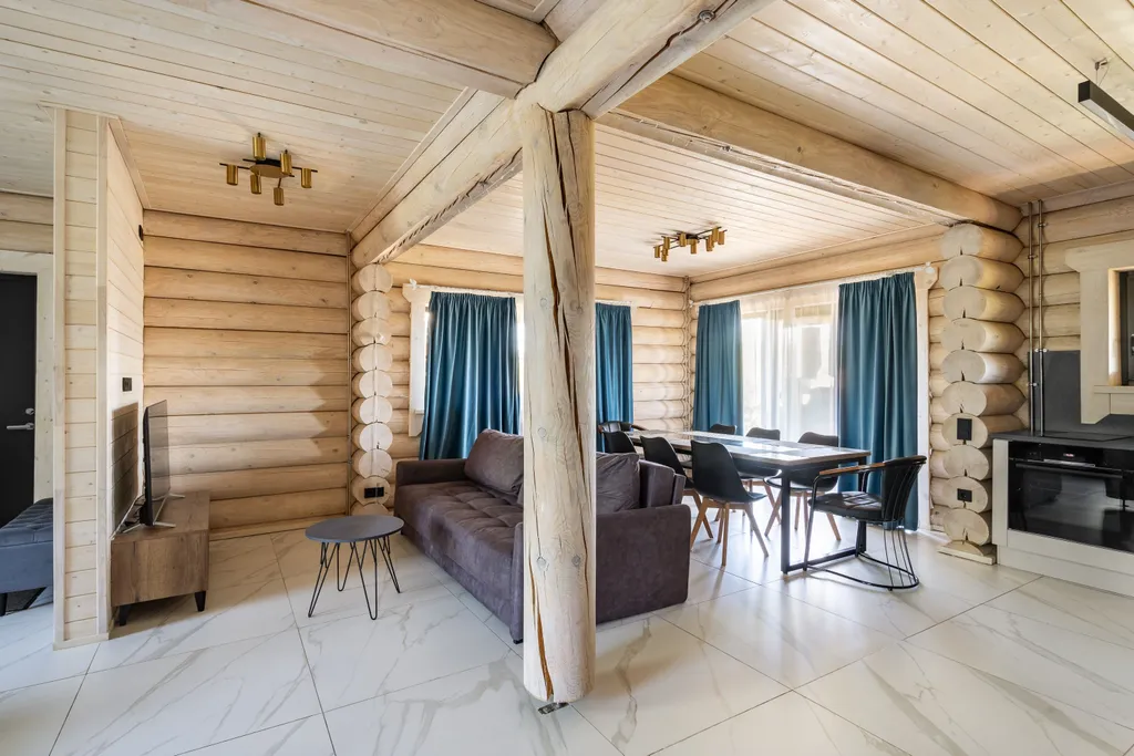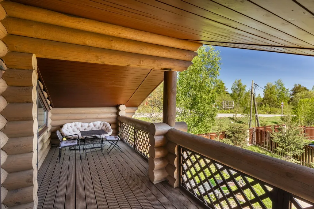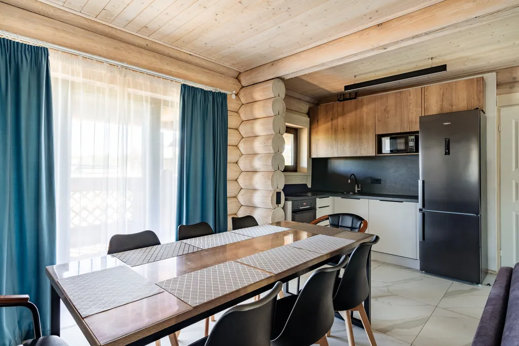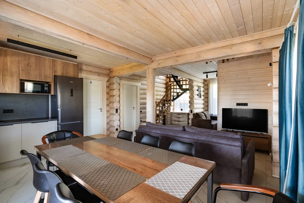 К услугам гостей 2 уютные спальни с двуспальными кроватями и 1 спальня с двумя раздельными кроватями на 1-ом и 2-ом этажах, 2 больших раскладывающихся дивана в зоне отдыха и гостиной. Кухня оборудована электроплитой, духовым шкафом и посудомоечной машиной, есть холодильник, чайник, кофеварка и микроволновая печь. В зоне кухни панорамное остекление с выходом на веранду. На каждом этаже имеется санузел и душ. Есть стиральная машина и фен. Проведено отопление, уложены теплые полы. Имеется WI-FI и цифровое ТВ.