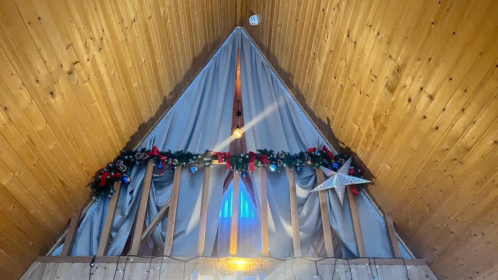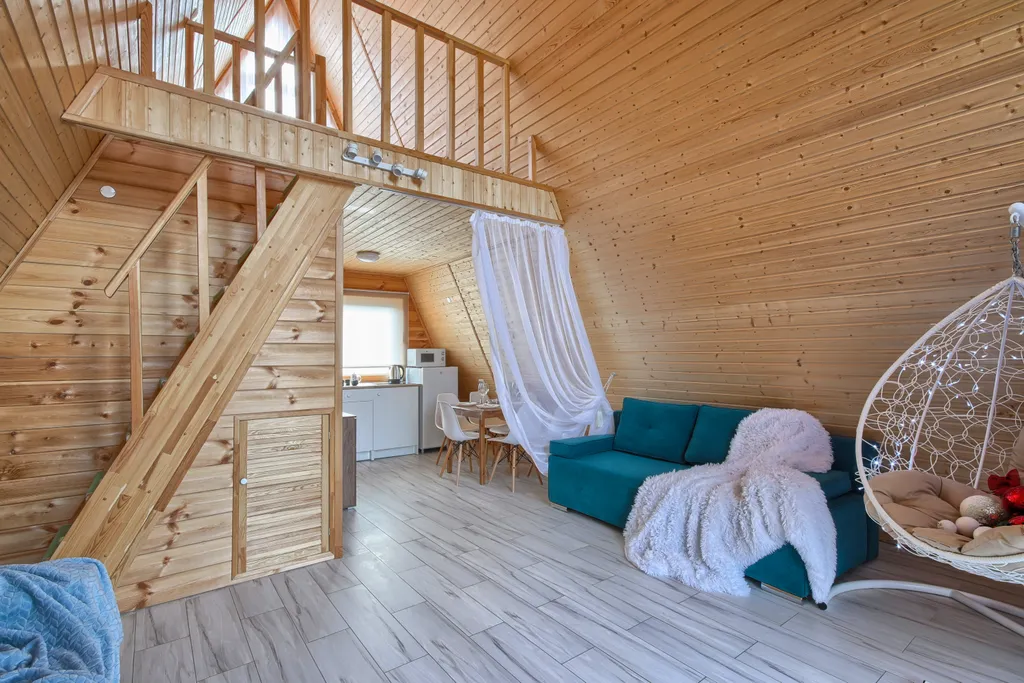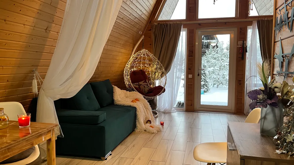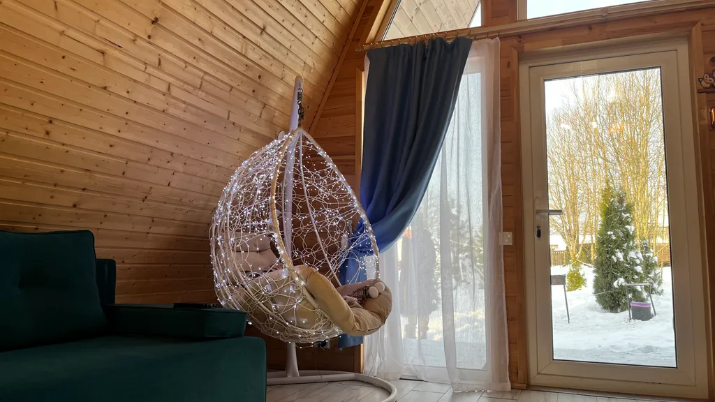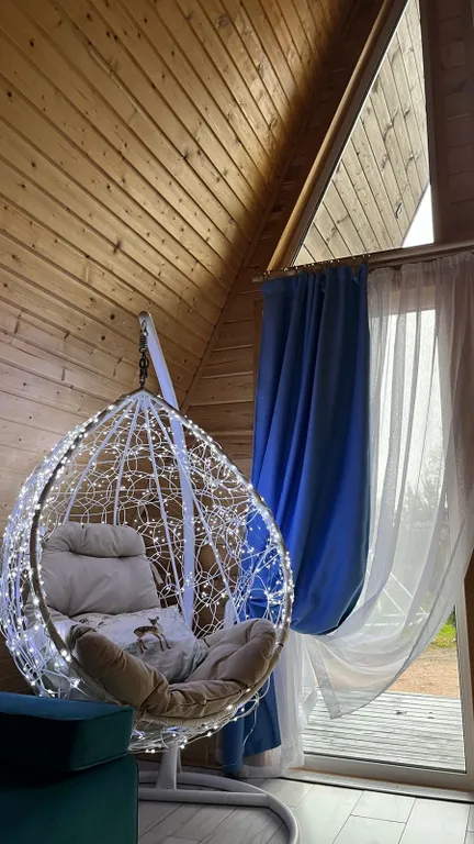 Здесь расположены два просторных дивана-кровати с независимым пружинным блоком и ортопедическим основанием, ЖК-телевизор и подвесное кресло-кокон с подсветкой.