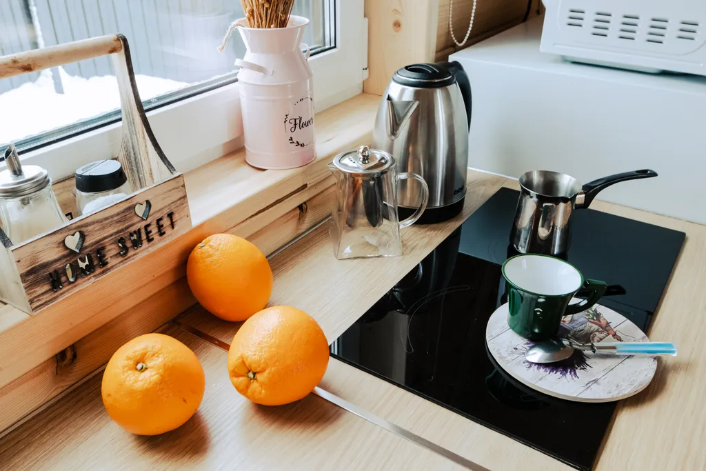 Кухня: варочная панель, микроволновая печь, холодильник и полный набор посуды для красивой сервировки.