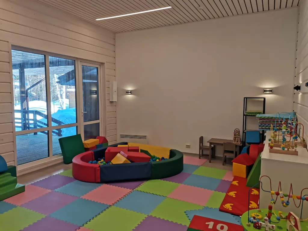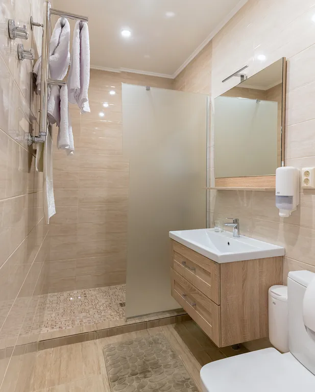 Дополнительное спальное место (раскладной диван), чайная станция, ЖК ТВ, холодильник, фен, деревянная мебель, просторная ванная комната с душем.