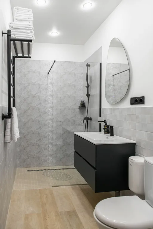 Дополнительное спальное место (раскладной диван в гостиной), фен, просторная ванная комната с душем.