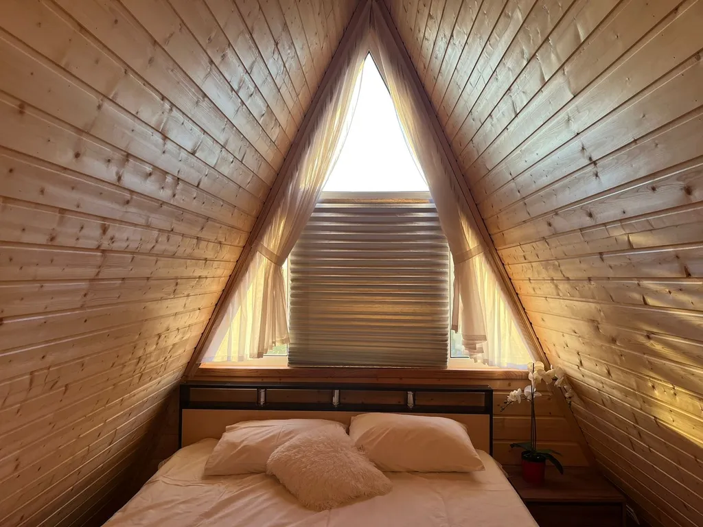 Спальня на антресоли (2 этаж): Уютное спальное место «под крышей» с большой двуспальной кроватью (160х200).