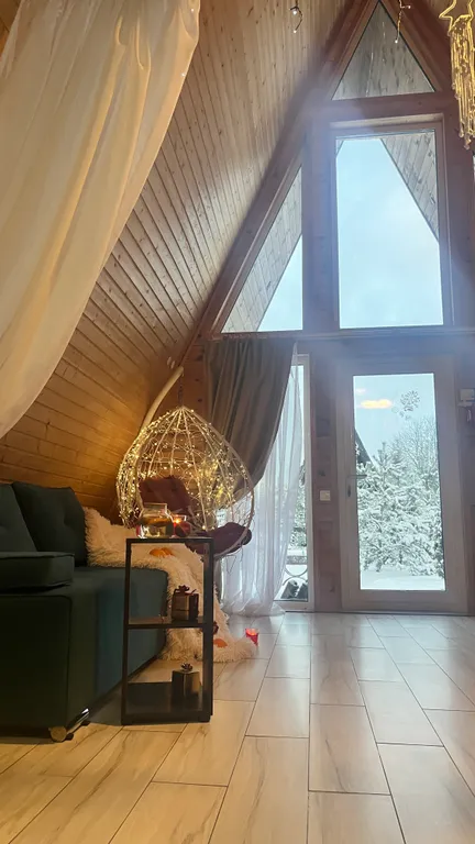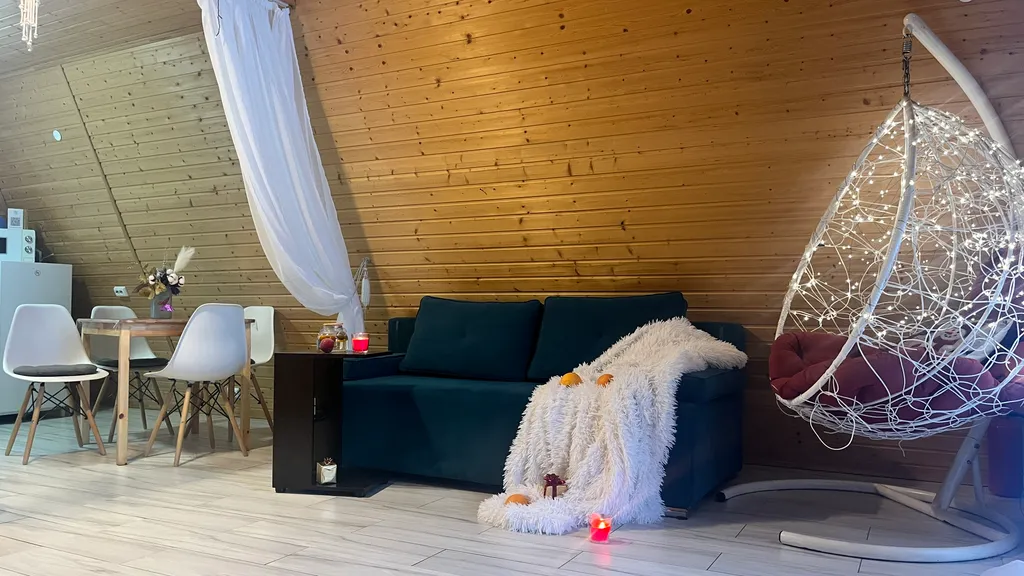 Здесь расположены два просторных дивана-кровати с независимым пружинным блоком и ортопедическим основанием, ЖК-телевизор и подвесное кресло-кокон с подсветкой.