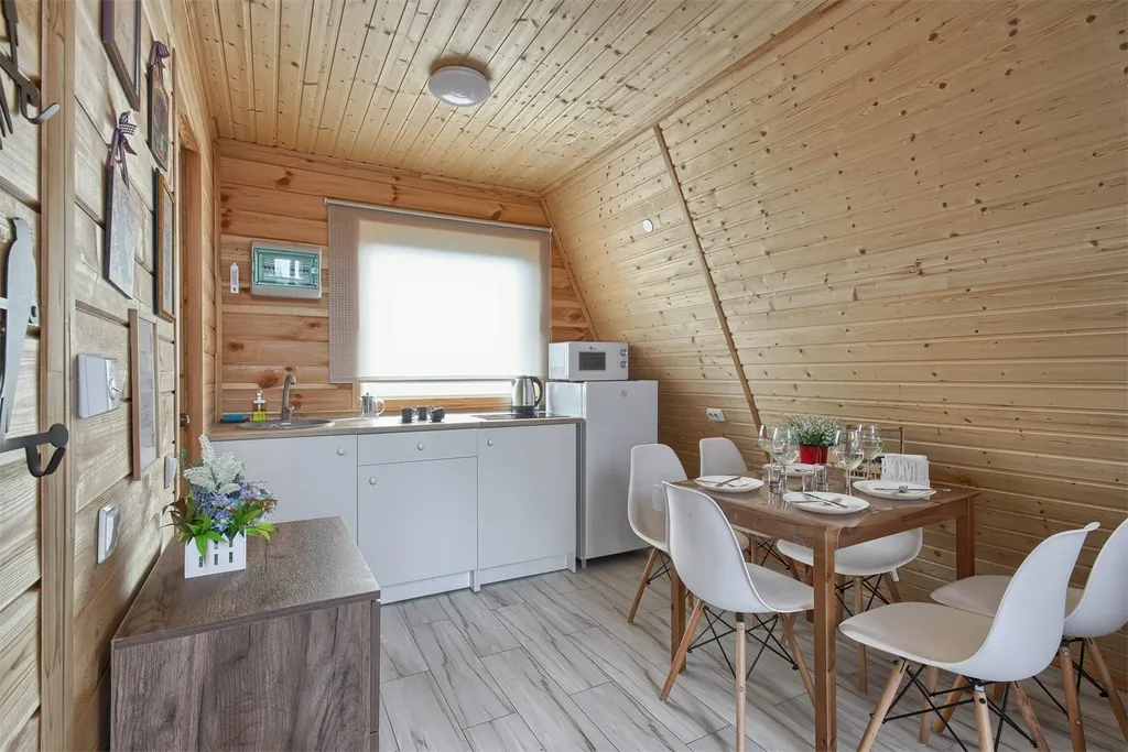 Кухня: Варочная панель, микроволновая печь, холодильник и полный набор посуды для красивой сервировки.